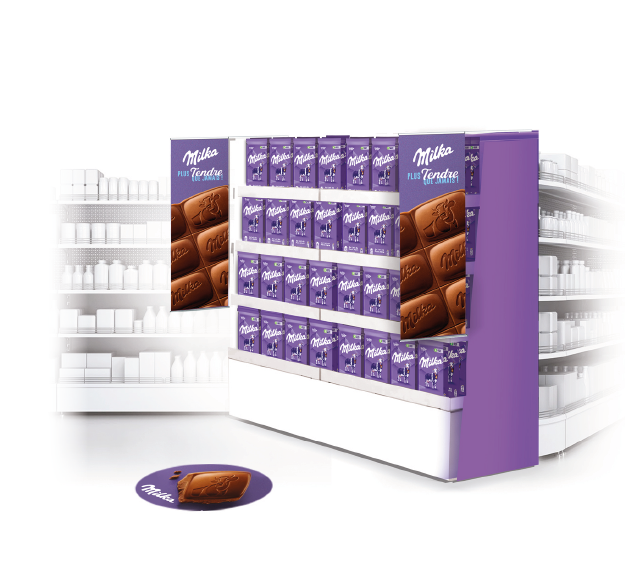 A partir d'un key visual donné, réalisation graphique de dispositifs d'aide à la vente en magasins et galeries commerciales : PLV, séparateurs, stickers, stands de dégustation, kakémonos, flyers et display géant.